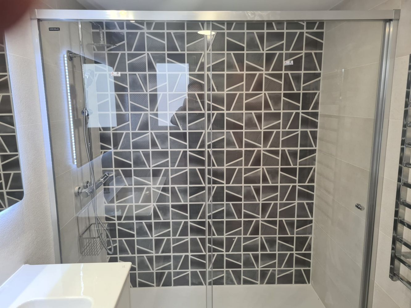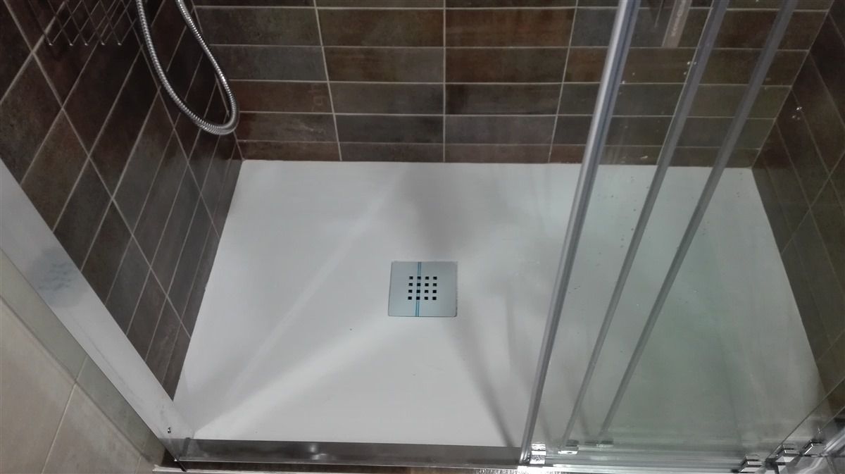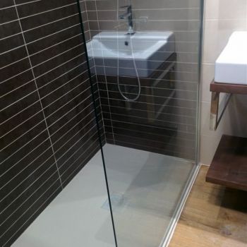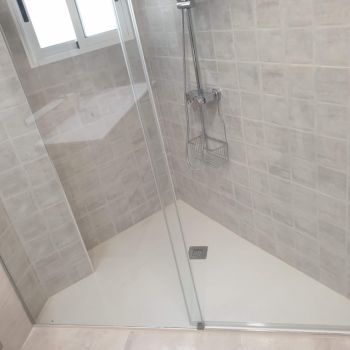 Obra realizada en una mañana, todos los profesionales perfectamente coordinados: Albañil, fontanero, instalador oficial de mampara y grifería, Alicatado con azulejo, plato de ducha textura Pizarra PIZARRA FINA, elevar o desplazar grifo
